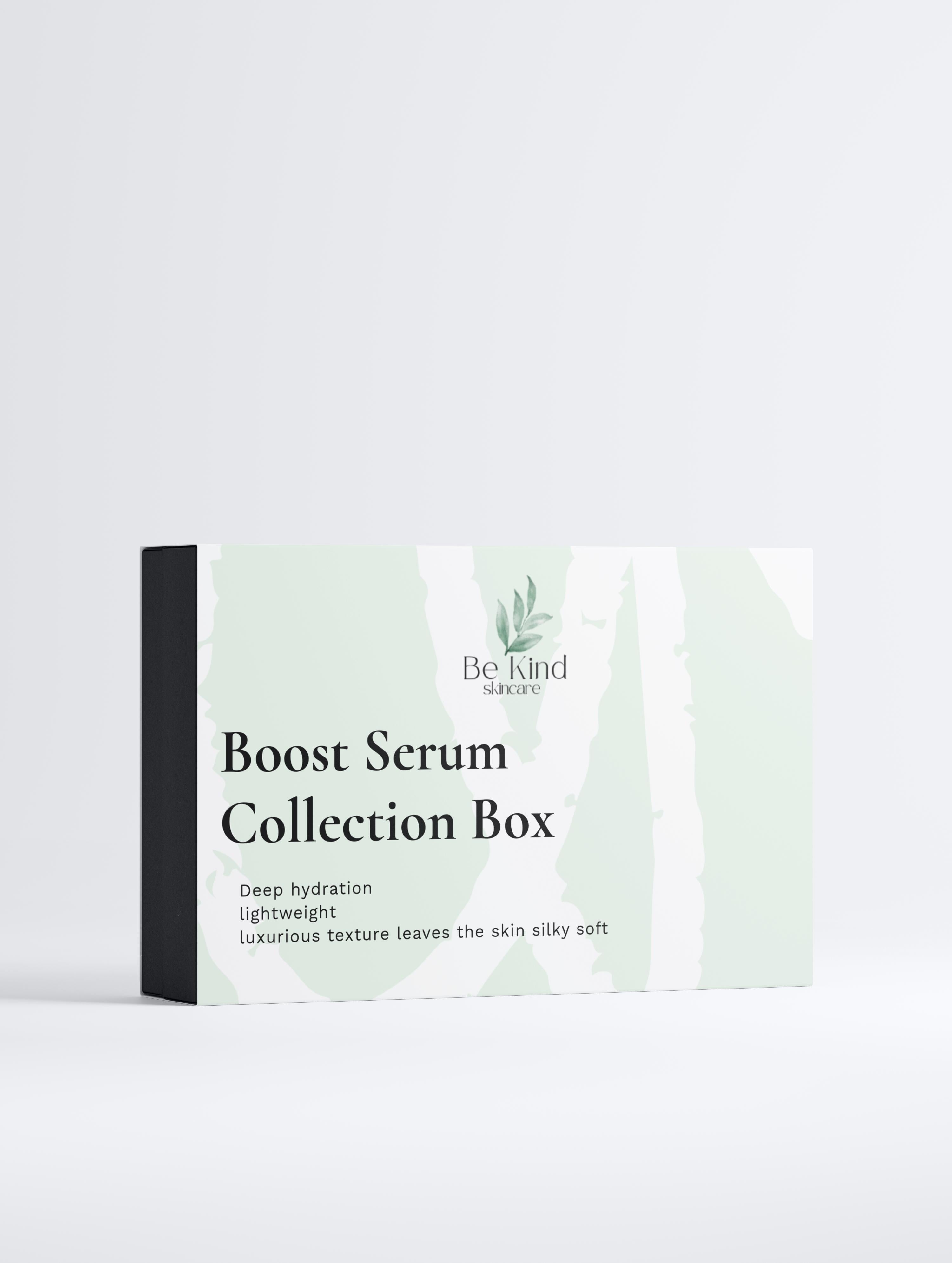Be kind skincare must-have selection of our top performing serums that will enhance skin’s elasticity and firmness. Packaged into a black box set with a box sleeve, that can be customised to showcase your brand identity and stand out in the beauty market.